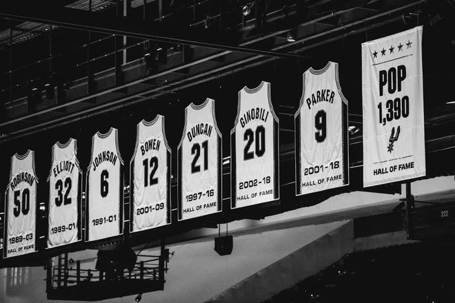 马刺已将名人堂主帅波波维奇的退役旗帜悄悄悬挂在主场球馆上空,与邓肯等多名球队名宿并列。